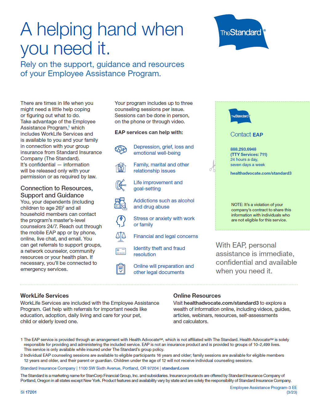 Your Employee Assistance Program. There are times in life when you might need a little help coping or figuring out what to do. Take advantage of the Employee Assistance Program, which includes WorkLIfe Services and is available to you and your family in connection with your group insurance from Standard Insurance Company (The Standard). See flyer.